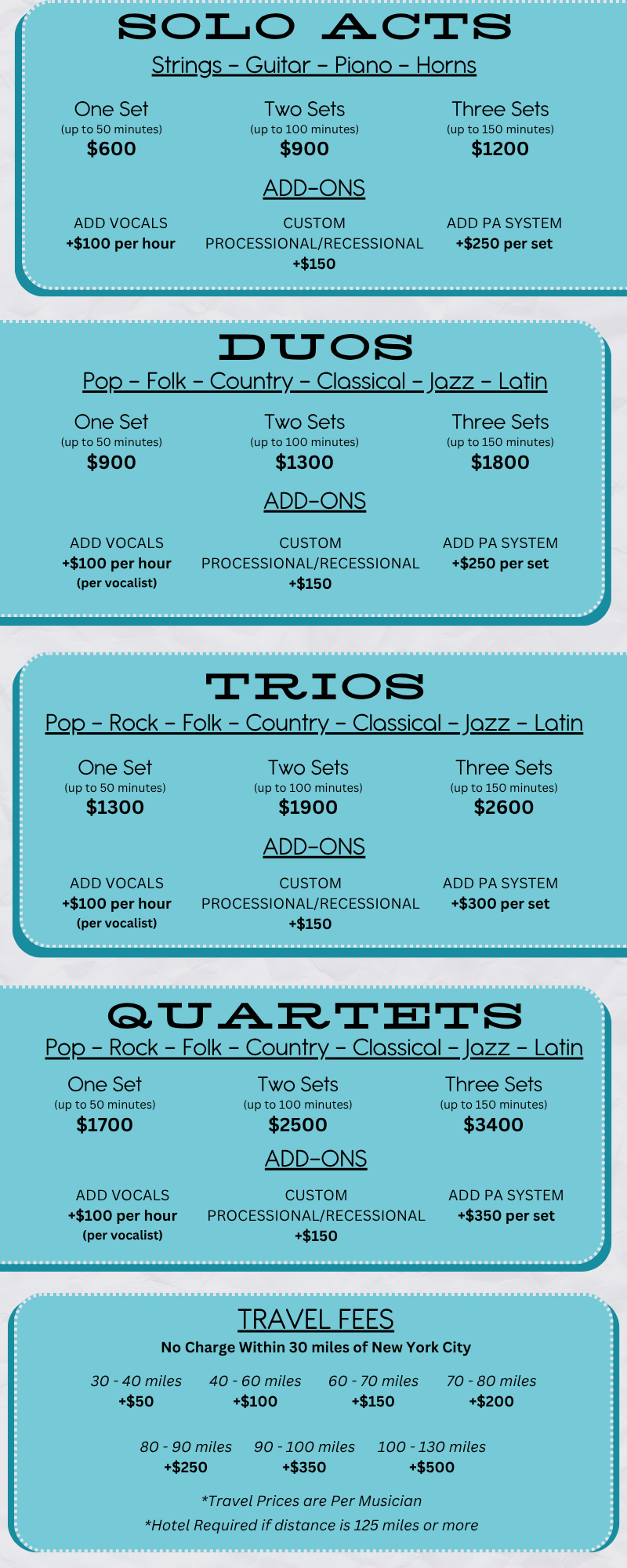 Travel within 30 miles of the city of New York is included within any standard package. For venues over 30 miles away, a transportation fee will be added and will depend on the number of people in your ensemble as well as the distance to the venue. Please view our pricing above for more details on travel fees.