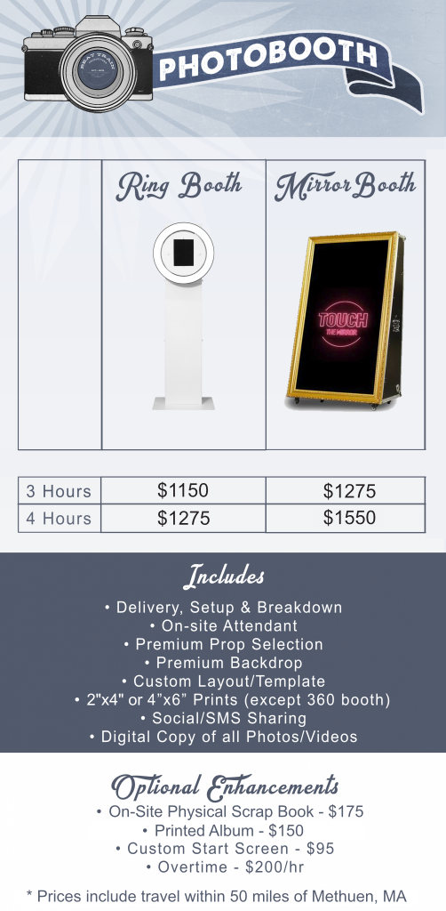 Capture the spirit of your wedding by adding a Photobooth package to your booking! Our booth delivers unlimited high quality digital images of your favorite moments. Best of all, we can include DJ, Uplighting, and Photo booth services in one easy contract.